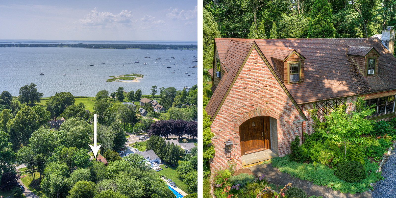 Sitting across from beautiful Blithewold Mansion & Gardens and evoking a gatehouse on a grand estate, this charming 3 to 4-bedroom English Cottage is styled in the vernacular of the neighboring mansions. The grounds and gardens offer four seasons of interest, while inside the stone-floored entry with a vintage arched cast iron fireplace folly and expansive open living and dining spaces lend enduring charm. The gas fireplace features quartered oak paneling and acanthus leaf corbels, while the dining area looks out double French doors onto a large deck. The kitchen continues the English ambiance with oak cabinetry and soapstone counters, with a stately library or first-floor ensuite capping off the main floor. Finally, the curved staircase leads up to three well-proportioned bedrooms to rest up for another day enjoying Bristol’s amazing amenities, including the East Bay Bike Path, yachting facilities, seaside dining, and unique shopping.