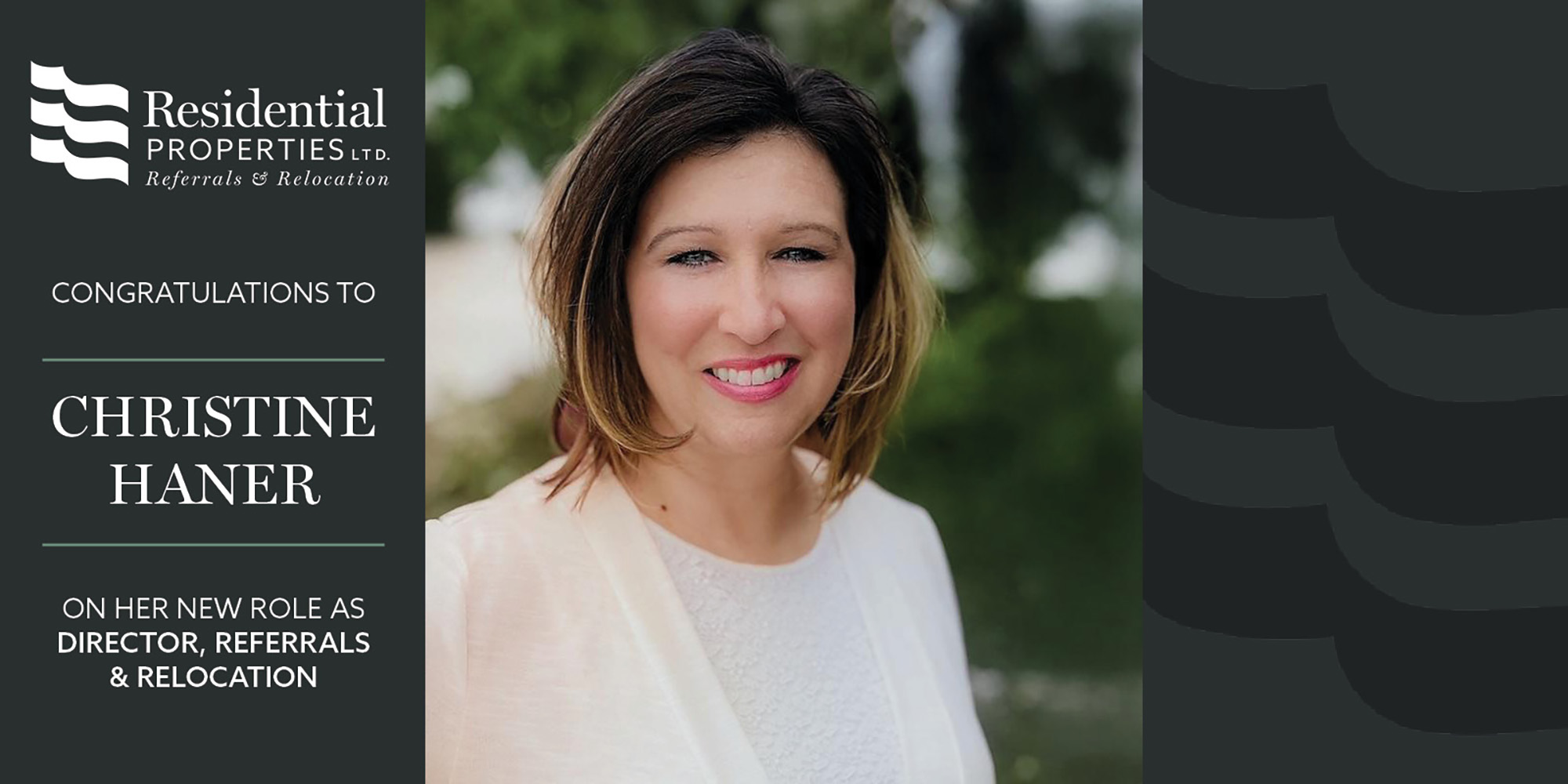 Residential Properties Ltd. is happy to announce that Christine Haner will now serve as the company’s Director of Referrals & Relocation, leveraging her nearly 20 years of expertise. Christine proudly assumes the role following the retirement of Liz Messier, Residential Properties’ Vice President of Corporate and Relocation Services for more than 25 years. Christine will carry on the standard set by Liz along with Senior Relocation Specialist Fran Foster as they continue to grow and enhance our services.