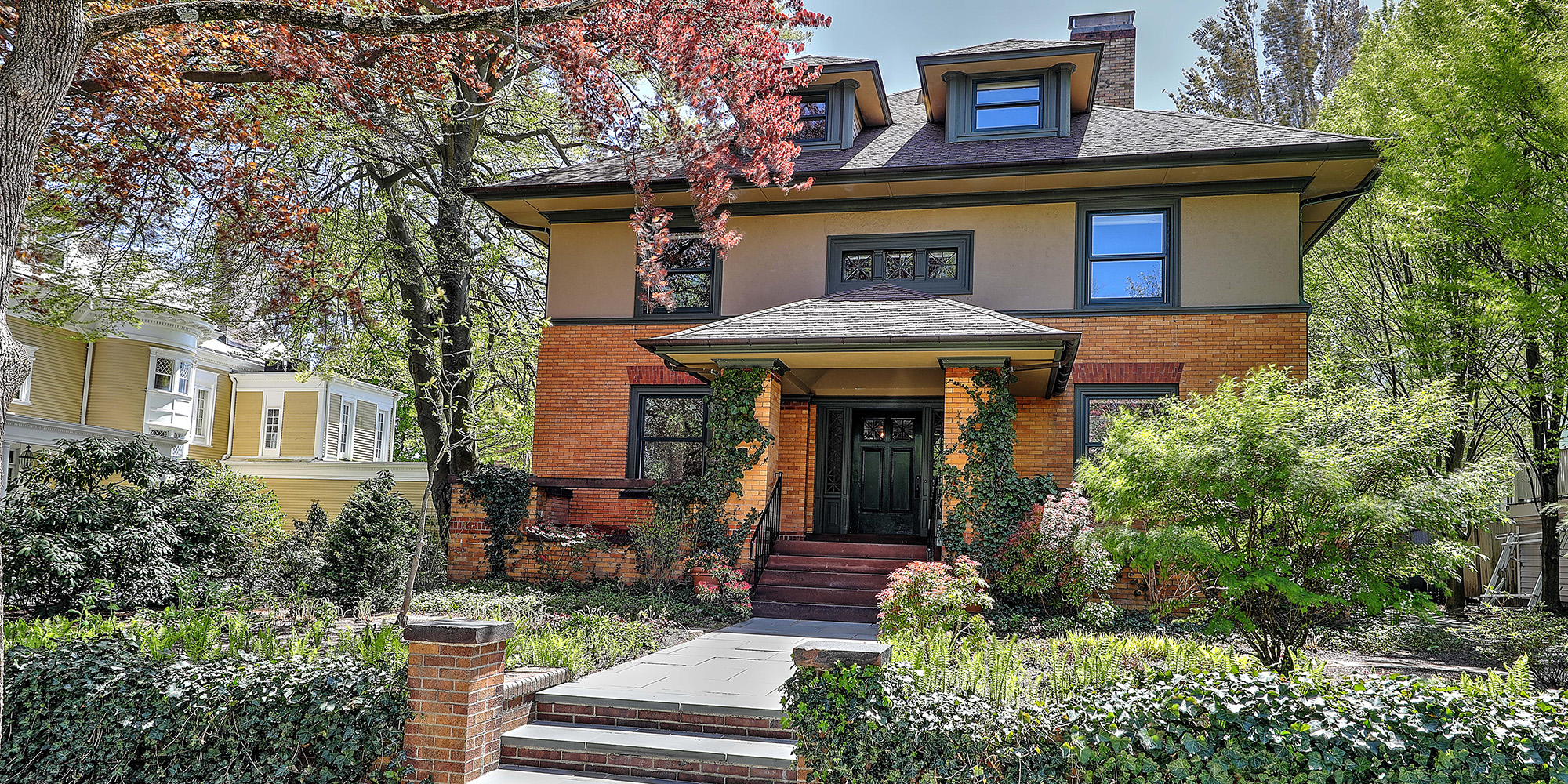 This stunning, circa-1903 Prairie Style home in a coveted College Hill location presents 8 bedrooms, 3.2 baths, and classic architectural detail. Clad in brick and stucco, the exterior is defined by an expansive front porch, wide columns, and heavy eaves. Inside, preserved original details include beamed ceilings, raised paneled walls, leaded glass windows, and rich wood floors. The sitting room and library share back-to-back fireplaces and large windows that fill the space with natural light. A side porch leads out to a wood deck, stone terrace, and lush garden. The elegant dining room features bay windows, raised paneling, and beamed ceilings, while the butler’s pantry leads to a stunning eat-in kitchen with a large island, stone counters, top-tier appliances, and a breakfast nook overlooking the garden. The style continues in the spacious primary suite, home office, and finished lower-level rec room with luxury and character throughout.