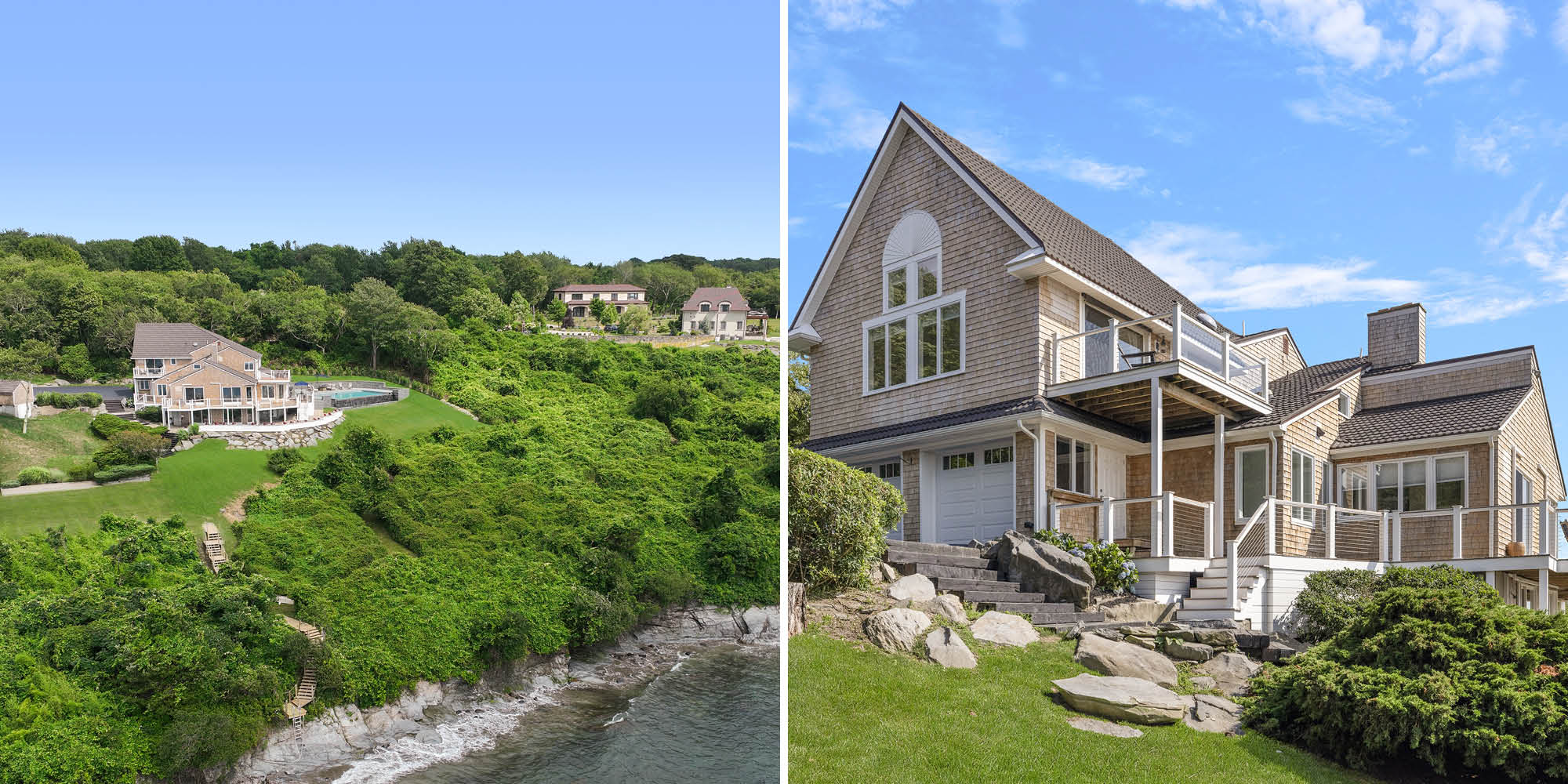 This stunning, 4-bedroom, 4.5-bath Beavertail retreat sits on 2.5 acres of pristine waterfront. The newly renovated home offers breathtaking, panoramic views of Narragansett Bay from the Jamestown Bridge to Block Island. The main level features a chef's kitchen equipped with state-of-the-art appliances and elegant finishes flowing into an expansive living room with a dry bar and wood stove. A dining area filled with sunlight and endless ocean views extends outdoors to a wrap-around deck that leads to an infinity-edge pool set against a serene bluestone patio with outdoor kitchen. A primary suite with deck access and a full bath featuring a dressing room, den, and half bath with laundry round out the main level. An upper-level primary suite includes a balcony, custom walk-in closet, and full bath. The lower level offers versatile space including a family room, laundry room, full bath, and an office/den. Private stairs lead down to the shoreline for the ultimate waterfront lifestyle with private moorings.